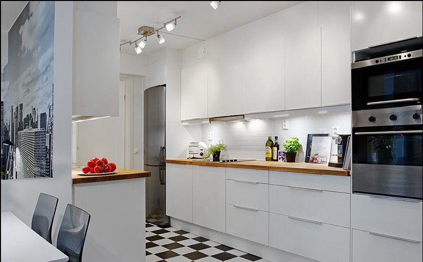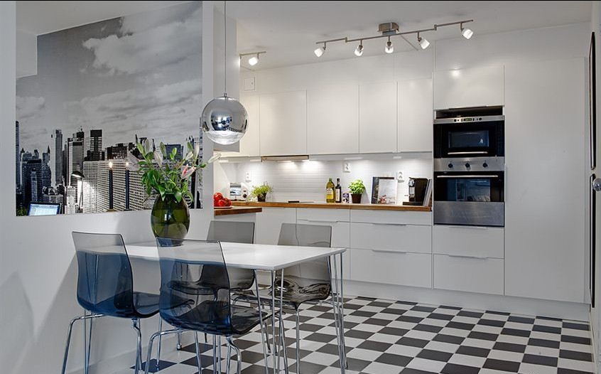 半開(kāi)放式的廚房里,小餐廳就在這里,餐桌上的綠色在潔凈的空間里更顯得清新浪漫。類(lèi)似于國(guó)際象棋盤(pán)一樣的地磚卻又能給我們帶來(lái)濃濃的懷舊情結(jié)。在不相配的元素搭配下卻能成就一個(gè)和諧的空間,這就是現(xiàn)代簡(jiǎn)約的魅力。