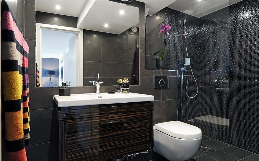 衛(wèi)生間里的色彩雖然是深色系當(dāng)?shù)?,但是它的灰色的穿插光的反射都有了不一樣的效果?/p>