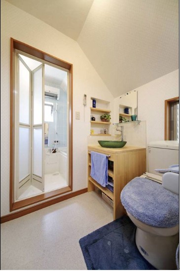 洗手間白色作為底色點(diǎn)綴少許藍(lán)色,藍(lán)色的地毯和毛巾,給人干凈純潔的感覺,而且風(fēng)格一致。