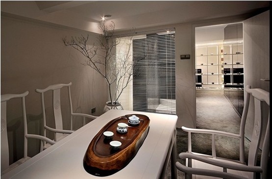 墻面裝飾裝飾物與墻面造型想結(jié)合,別有一番風(fēng)味。不知道是否可以用落葉歸根來(lái)解釋家的定義,這樣可以給凄涼的裝飾披上一件大衣,在含義上提升了整個(gè)空間的暖度。提取了明清時(shí)期官帽椅的樣式,褪去了古色古香的韻味,從而運(yùn)用奶白色來(lái)代替,正與大體色調(diào)相呼應(yīng),也把人的視覺(jué)中心點(diǎn)集中于餐桌的茶具上。