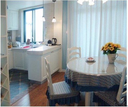 廚房開放式設(shè)計(jì),通透的空間依舊是藍(lán)白色搭配,家具用的簡潔恰當(dāng)。小小的圓桌,格子的桌布,清新怡人。向日葵則給餐廳空間增添一抹亮色,溫馨的氣息撲面而來。
