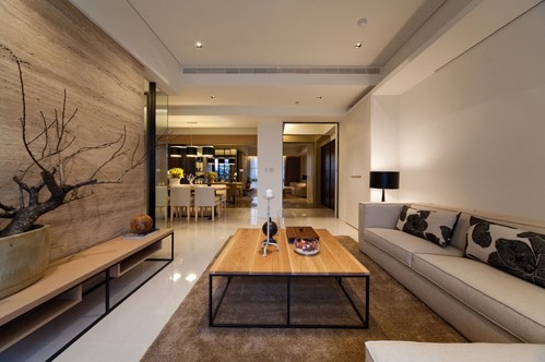 站在客廳就能看到書房。形成一個(gè)半開放式的??蛷d地面彩用的是白色的拋光磚。沙發(fā)圍繞著茶幾,沙發(fā)獨(dú)立成組靠在一角,給人一種舒適安靜的感覺。