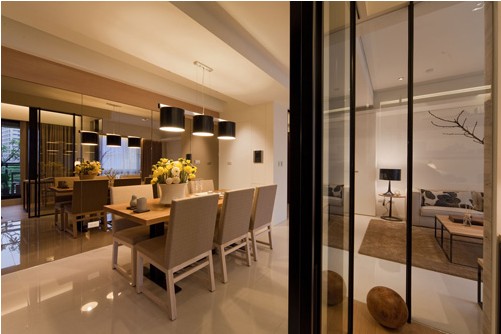 餐廳是家居生活的心臟,不僅要美觀,更重要的實(shí)用性,整體性。餐廳的燈光很重要既不能太強(qiáng)又不能太弱,燈光則以溫馨和暖的黃色為基調(diào),頂部做了簡單的吊頂。由于空間不是很寬,因此把餐區(qū)面墻做成一整面墻的鏡子,讓人坐在其中不覺得壓抑,有了這面鏡子,更顯得餐區(qū)有了生氣,餐區(qū)的地面采用的是米白色拋光磚。