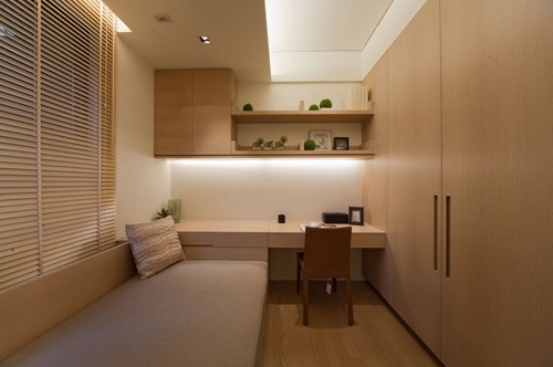 書房兼書房,此房間做了簡單的天花造型,頂上藏?zé)魩?。由于空間不是很大,房間做了一排壁柜就只能放一張小床了。有了這間小房間讓親戚朋友來家可以做一個(gè)睡房,沒客人就把它當(dāng)書房,既方便又使用。