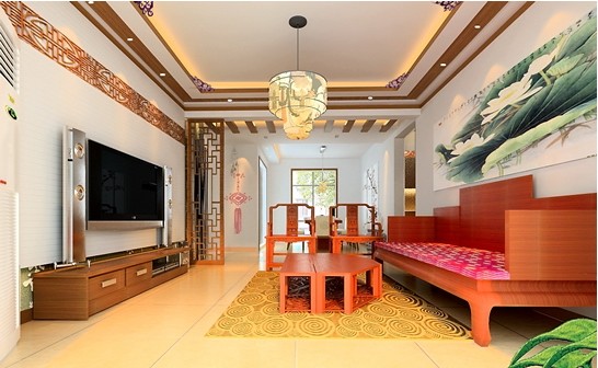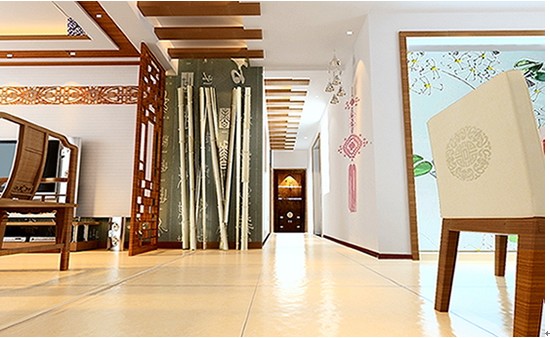 這張是本案例的進(jìn)門視角效果圖,進(jìn)門背景用的是中過古文化中的甲骨文墻紙做裝飾,加上帶有中國古文化的竹子的擺設(shè),充分的體現(xiàn)出了中國傳統(tǒng)文化的優(yōu)雅氣質(zhì),屏風(fēng)是中國古元素在裝飾上面用的比較多的隔斷裝飾,在電視背景邊的裝飾屏風(fēng)隔斷是分開了走道區(qū)域與客廳區(qū)域的空間,再加上帶有木質(zhì)格柵的頂面效果充分的體現(xiàn)出了中國的古文化的底蘊,走道的延伸式格柵吊頂充分的規(guī)劃出走道的自然效果!
