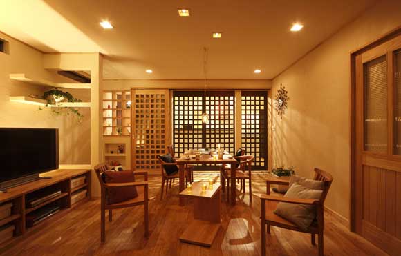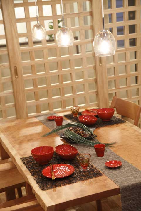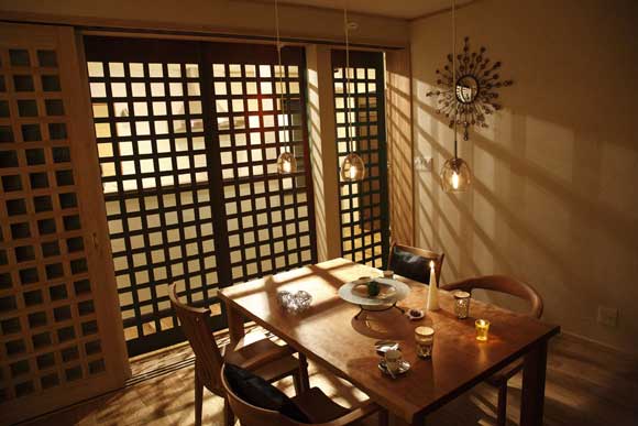 飯廳里的桌椅都是木頭做的,上圖為自色光線情況下,有著另外一翻情調(diào)。燈光穿過格子屏風(fēng)投影在墻上,繪出交錯(cuò)的線條,光與影的藝術(shù)讓這個(gè)飯廳顯得與別不同。格子屏風(fēng)是裝飾上的一大美點(diǎn)所在。