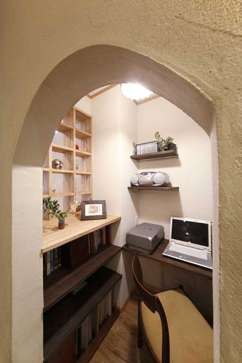 對(duì)應(yīng)著廚房的另一個(gè)角落,原先可以說一個(gè)家居死角,改良后成為一個(gè)小小的工作間,加以拱形的門設(shè)計(jì),又多了一些些活潑可愛的格調(diào)。