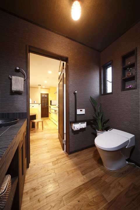衛(wèi)生間里采用墻紙鋪貼有點(diǎn)像樹木表皮的感覺,配上綠色植物,讓人有種置身于熱帶雨林的錯(cuò)覺,這種風(fēng)格非常純樸,當(dāng)之森林系家居!