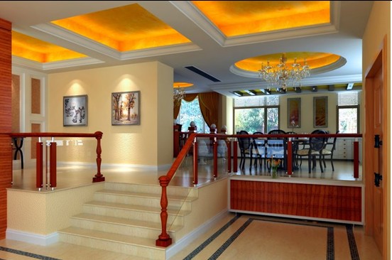 客廳是交友娛樂中心,影視墻采用兩邊櫻桃木飾面板內(nèi)藏光管,中間是金花米黃大理石。再在客廳里放上兩株植物,顯得生機不少??蛷d里的窗戶窗套都采用波浪板做的造型。客廳墻面色彩為米黃色,本別墅中客廳采用液晶電視,安裝高度為1.3m左右。正好是坐在沙發(fā)上人的視線高度。8人組的真皮沙發(fā),既大方又有氣派。地面選擇了米黃色大理石。