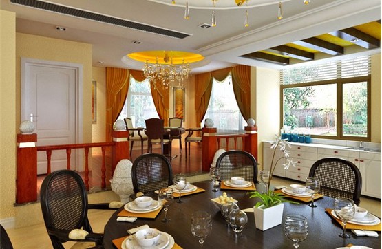 餐區(qū)整體效果色調(diào)以暖色為主,天花造型里的頂面墻上貼金色的墻紙,石膏板上粘貼石膏線條,離窗邊1.5米的地方有一條梁,設(shè)計師就把天花吊得與梁同高,然后在梁與窗中的地方用15*20公分的的假梁用黑胡桃飾面板包一圈。并在梁的側(cè)面走一圈石膏線。窗下做了一排餐邊柜并在柜中按上洗手盆,這樣做我覺得挺人性化的,吃飯前后都可以在這洗手,干凈又衛(wèi)生。餐體的圓型吊頂配上圓桌更顯大氣。