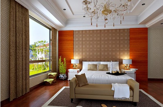 臥室吊頂采用石膏線做裝飾,床背景是由櫻桃木做裝飾,中間為布藝軟包。墻面貼藝術(shù)墻紙。