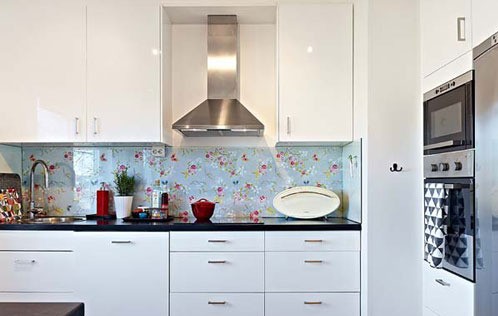 富有田園風的花朵壁紙襯托白色櫥柜,與整個空間裝飾相互呼應,藍與白的對比色調搭配,讓人有種親切的舒適感。而背景墻上零星點綴的花朵,成功營造了視覺亮點。料理臺上一些小裝飾,則為色調簡單的廚房注入了鮮活。
