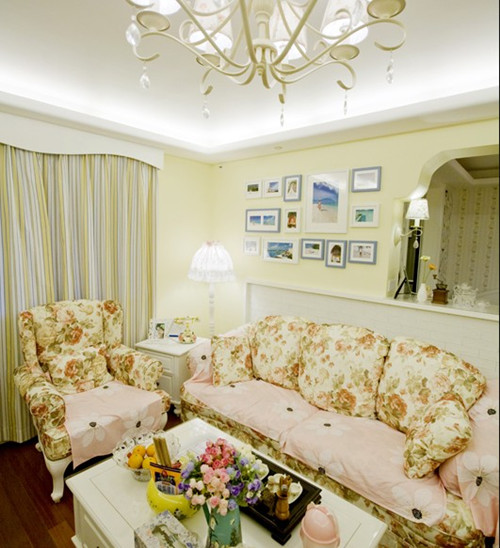 田園風(fēng)格的客廳,墻面上是淡雅的淡黃色墻面墻漆,溫馨感由面而來(lái)。沙發(fā)的碎花與淡淡的粉色墊布映稱(chēng)著墻面,空間的層次感突顯。