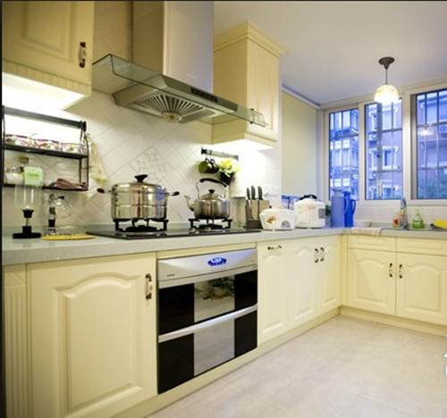 這個(gè)廚房面積不錯(cuò)的,俗話說(shuō)巧婦也是需要練成的。L型的廚柜使廚房更顯寬大,藍(lán)色的有機(jī)玻璃透著光潔的光,廚房也顯得干凈明亮許多。