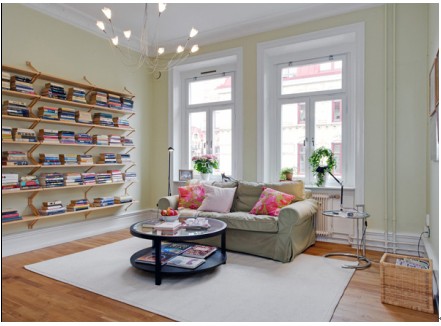 米黃色的墻面比白色更多了那么一絲的溫暖,窗下的布藝沙發(fā)柔軟舒適。淺灰色的布套配以粉色的印花,北歐的簡潔風(fēng)格中加點自己個性的小裝飾。墻面的層架上整齊的堆放書籍,午后在清新自然的小屋中讀本趣味盎然的書好好放松一下。