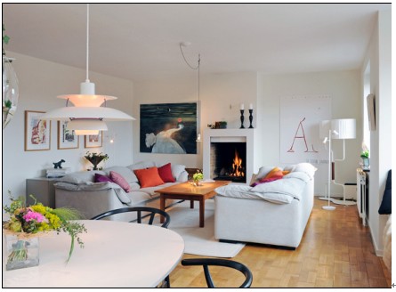 白色的墻面上黑色的簡約層架,即是裝飾品又是儲物空間。熊熊燃燒的篝火也許不太適合中國的家庭,但仿壁爐式的取暖爐配合一下煙囪的造型,在寒冷的天帶來暖風(fēng)的同時,不同用出國就能感受北歐般的生活。