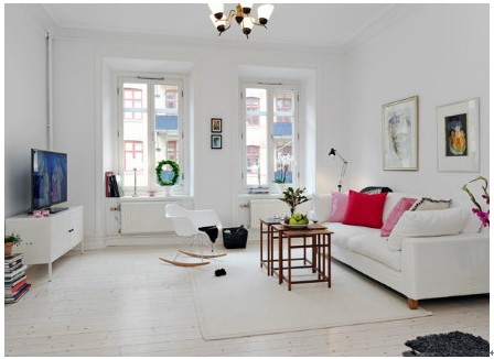 白色的沙發(fā)上擺放著紅與粉的靠枕格外耀眼,粉與紅色彩又淺到深逐漸變化,在大片白色的襯托下有著很強(qiáng)的活躍感。墻面上懸掛著大小不同的壁畫,使白色的墻面不會顯得單調(diào)。搖動靠椅的出現(xiàn)在小清新的生活中添加些一絲樂趣。