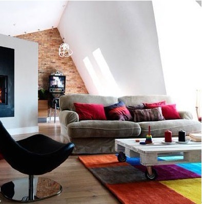 客廳布置設(shè)計(jì)的豐盈而立體,糖果色的靠枕,彩色拼接地毯,出眾的色彩搭配立刻讓灰色的沙發(fā)外觀變得豐滿起來,使得客廳盡顯歡快本色。