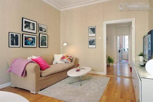 這個淡淡茶色的墻壁與深色的沙發(fā)相呼應(yīng),有著層次分明的搭配感。而顏色艷麗的軟軟靠墊則又是一鮮明的跳躍感。茶幾是簡約風(fēng)格的,連同短毛地毯也是簡潔的裝飾物。電視柜則是一個很好的收納空間,可以有效的收放家里所有的影碟,樂盤等等。這個房型實(shí)用面積不超過60平,風(fēng)格有點(diǎn)北歐的感覺,不過卻是用現(xiàn)代的手法裝修,在軟裝飾上借用了北歐,這樣可以放大利用空間。