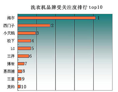 洗衣機(jī)行業(yè)的黑馬并不多,本周的洗衣機(jī)品牌關(guān)注度排行榜上,沒(méi)有懸念地,海爾再獲第一,遠(yuǎn)遠(yuǎn)領(lǐng)先于第二名西門(mén)子。在海爾多種洗衣概念的沖擊下,消費(fèi)偏好的影響已經(jīng)顯示。而西門(mén)子憑借多年的品牌影響以及優(yōu)秀的品質(zhì)牢牢占據(jù)第二。小天鵝、松下是國(guó)人熟悉的老品牌,接受度仍然較高,分別占據(jù)第三和第四名。
