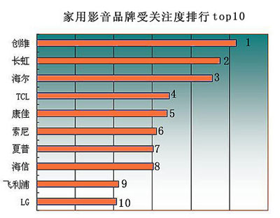 從家用影音品牌的關(guān)注度TOP10可以看出該領(lǐng)域的競(jìng)爭(zhēng)之激烈,沒(méi)有絕對(duì)的第一,只有你超我趕中的動(dòng)態(tài)排行,在本周的家用影音排行榜中,創(chuàng)維長(zhǎng)虹海爾位列前三甲,在這個(gè)中華傳統(tǒng)節(jié)日中,國(guó)產(chǎn)平板電視揚(yáng)眉吐氣,獲得階段性的勝利。