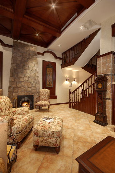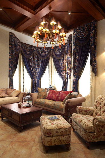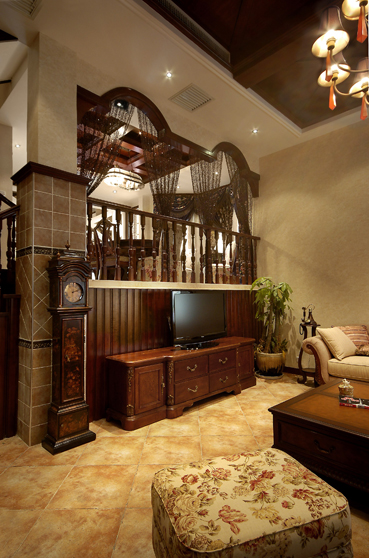 如前所述,此空間定性為美式風(fēng)格.那么用材便有了范圍—-磚,紙,木,布藝等.便捷,隨意,休閑是美國人居最為強(qiáng)調(diào)的,于是,此空間也不無例外.如客廳和餐廳極為突出,整個(gè)環(huán)境決不刻意賣弄性的作無畏裝點(diǎn).當(dāng)中強(qiáng)調(diào)交通流線的合理,起居休閑時(shí)的舒適和諧,功能布置的實(shí)用于方便.為了提煉出整個(gè)空間的層次與文化積淀,用才上,特別是對(duì)于磚的取材,考慮的都是仿舊仿古系列,好像在訴說這是一個(gè)家族一代一代輝煌的生活傳承.縱閱整個(gè)別墅,窗簾布藝在此當(dāng)中起到了不可忽視的作用,從最基礎(chǔ)的為每個(gè)特性空間調(diào)節(jié)人居生活認(rèn)為合適光度之外,他們自身獨(dú)特的花紋,掛式以及色感為這個(gè)以美式定義的空間增添出浪漫,個(gè)性,舒適大氣的視覺美感.在家具陳列選擇上,強(qiáng)調(diào)整體風(fēng)格的統(tǒng)一—大氣,隨意,輕松.每個(gè)個(gè)體家具表現(xiàn)的氣質(zhì)同樣非常獨(dú)到,同時(shí)也非常配合的表現(xiàn)出懷舊與人文傳承的個(gè)性.