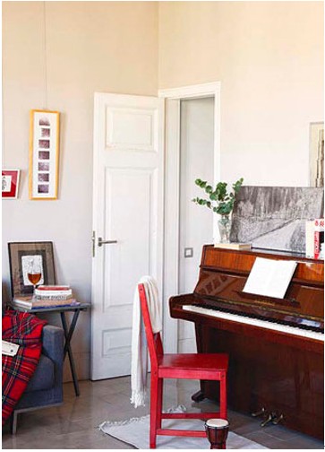 深棕色鋼琴給這個(gè)空間增添了不少藝術(shù)氣息,而造型簡(jiǎn)單的紅色靠椅會(huì)顯得空間沒(méi)那么單調(diào),總能讓人心情愉悅。