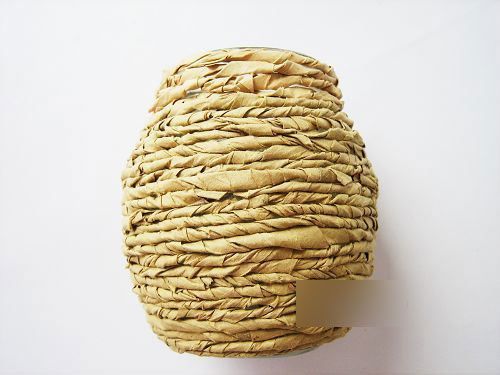 在瓶子表面貼上雙面膠。把紙繩從底部開始一圈一圈繞著瓶子纏,纏的過(guò)程中,用手按壓,使其粘得牢固。