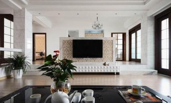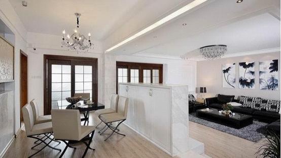 互補(bǔ)才能相得益彰,在空間里,設(shè)計(jì)師沒(méi)有過(guò)度的去追求新時(shí)代的簡(jiǎn)約設(shè)計(jì),在大面積采用簡(jiǎn)潔手法的同時(shí),用復(fù)雜的墻紙或裝飾來(lái)烘托出整個(gè)空間的亮點(diǎn)所在。電視背景墻集美觀與實(shí)用于一身,客廳面看過(guò)去是個(gè)造型美觀的電視背景墻,從餐廳觀望過(guò)去,卻是個(gè)功能強(qiáng)大的儲(chǔ)物柜。隔斷使得空間更為通透和大氣。