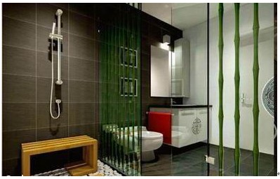 鮮艷的玻璃隔斷,打破了衛(wèi)生間的傳統(tǒng)色調,空間看上去更加靈動。綠色竹林搭配上淋浴區(qū)鵝卵石的鋪設,當水從石縫流走猶如林子的小溪,使人有一種進入大自然的感覺。