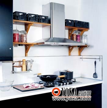 由于空間上的限制,在滿足基本的使用功能后,小廚房的儲(chǔ)物空間往往會(huì)顯得比較緊張,因而需要最大限度地挖掘可利用空間,擴(kuò)大空間感,盡量避免死角。抽油煙機(jī)上方的空間很容易被遺忘,但因地制宜地增添可儲(chǔ)物的隔板后,也能解決小廚房的收納問(wèn)題。