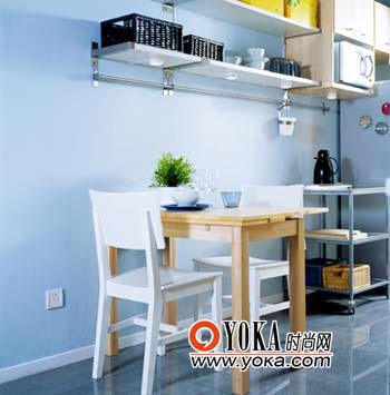 小戶型的類似功能區(qū)應(yīng)盡量合并、重疊,如廚房和餐廳區(qū)域的共用,走餐廳廚房一體化的路線。可延展的餐桌和帶有滑輪的推車都能靈活運(yùn)用于這樣可變換功能的廚房里。
