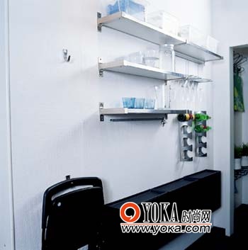 在廚房的適當(dāng)位置裝一些墻面支架,甚至可以把微波爐這種大件轉(zhuǎn)移過(guò)去,臺(tái)面就不再擁擠了。不過(guò),這類功能性極強(qiáng)的墻面擱板或支架一定要買質(zhì)量好、承重能力強(qiáng)的。另外廚房?jī)?nèi)的擱架和擱板可以有效地將繁多的烹飪調(diào)味品收納。
