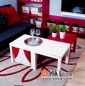 在家具的擺放上也有一定學(xué)問(wèn),要事先考慮到人行通道與家具之間的關(guān)系,讓家具與主人活動(dòng)的空間保持一定距離,盡量別在空間上發(fā)生沖突。于是將做收納用的小墩收放在茶幾之下,不僅功能沒(méi)有受到影響,而且將空間變得有序而整潔,而四個(gè)款式、型號(hào)完全相同,色彩有所變化的小茶幾可以根據(jù)功能需要隨時(shí)轉(zhuǎn)換拼接方式。