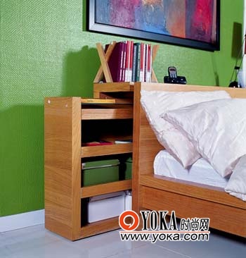 床后背板的設(shè)計(jì)不僅可以擺放一些經(jīng)常要用的東西,起到床頭柜的作用,而且板下的空間可以隱藏一些不常使用的零碎物件,但一定要給板下的柜子裝上靈巧可滑動(dòng)的滾輪,否則一旦放了重物,推拉就成問(wèn)題了。
