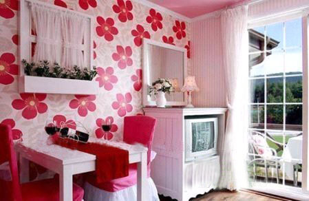 花朵在墻面上一朵朵綻放開來,像水彩畫一般,花瓣帶著暈染的感覺,加上色彩濃淡的配合,使墻壁富有極強的立體感?;ò冈绞秦S滿,越是能帶給人心理上的生長、擴張感,從而讓墻面變大。