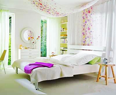 白色地面、家具、床品、窗簾,用大面積的白色營造出干凈通透的感覺;少量簡潔設計的臥室家具搭配純棉材質的床品,呈現出一派簡約率真的風格,而碎花床品和纖巧細條紋讓空間呈現出可愛的性感一面