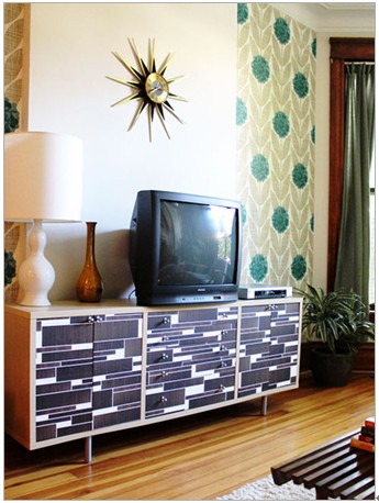 永不過時(shí)的拼接風(fēng)設(shè)計(jì),深受年輕人的喜愛。色塊拼接的電視柜可呼應(yīng)潮流的單品。背景墻綠色的球狀圖片搭配金屬質(zhì)感的太陽神鐘,讓整個(gè)空間有著古巴比倫的風(fēng)味,綠色的點(diǎn)綴有著初春的氣息。