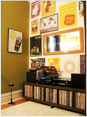 書房一角放滿了CD,閑暇時(shí)刻可以聽聽音樂或自己高歌一曲。收納方面CD全部放置在單層收納柜中。柜上放置著播放器和音響,書房一角的音樂小天地。墻壁上大大小小不一致的裝飾畫,讓這面墻壁從色彩到線條上都碰撞出一種**,為了很好的平衡這種視覺刺激,為了突出這面墻所來帶的刺激,在另一面墻的設(shè)計(jì)上只采用了墨綠的素色。