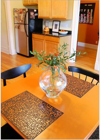 生機(jī)勃勃的花藝點(diǎn)綴居室一角,清新而鮮活,橙色的小花瓣也是特意選擇的,與整個(gè)空間色調(diào)向和諧。橙色的小飯桌,也很好的表達(dá)了空間的主題色調(diào)。斑駁的小桌墊增添了色彩的層次感和立體感。冰箱上可愛的小裝飾俏皮和生動(dòng)。