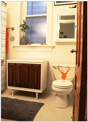 柔和的燈光可避免衛(wèi)浴間的冷清感,橘紅色的鹿頭裝飾在泛白的空間內(nèi)增添些鮮活。衛(wèi)浴間求整潔/明亮的同時(shí),收納也是很重要的一點(diǎn),這里沒有過多的裝飾,一面鏡子/兩用的收納柜,鏡子背后是收納柜哦,很實(shí)用又不占空間。