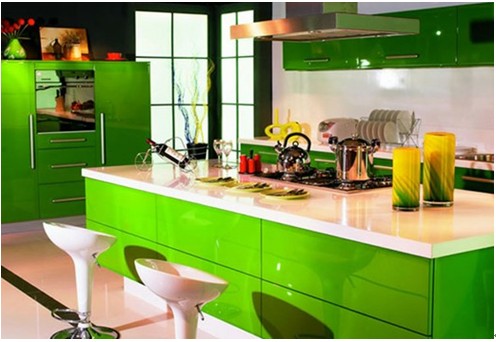 清新的明黃、嫩嫩的綠意、都無盡的透露著春意的到來,給生命已無數(shù)的期許。就讓充滿生命力的鮮活綠色走進人們的廚房,豐富視覺的想象力。不同程度的綠色空間主題,可讓廚房空間氛圍鮮活跳躍??臻g色彩搭配上可選用暗藍色的涂料,在配合草綠色的櫥柜及同色系的餐具,可使整個空間輕松氛圍與穩(wěn)重氣息很好地結(jié)合起來,營造出一種輕松、明快的廚房環(huán)境。