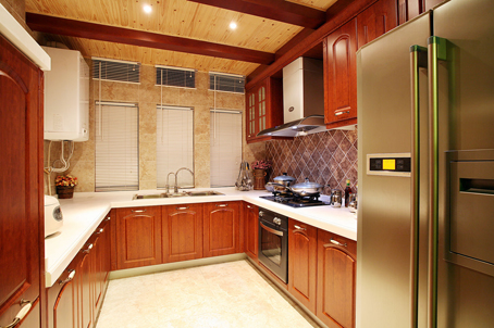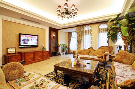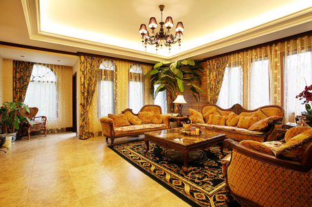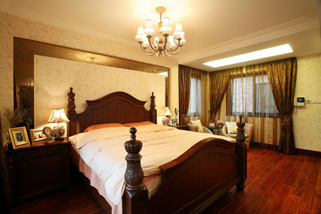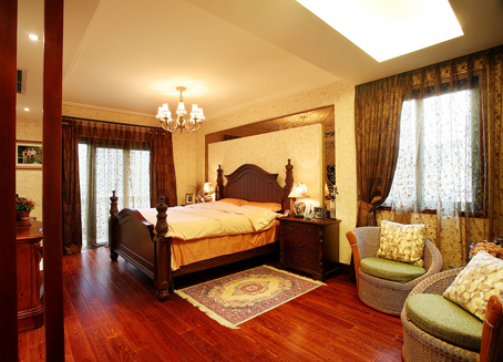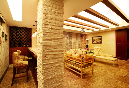 一套完美的方案是不成立的,正因?yàn)椴淮嬖谕昝溃粤η蟾?。這套方案在立面和頂面設(shè)計(jì)造型相對(duì)簡(jiǎn)單,主要是通過(guò)塊面的設(shè)計(jì)及材質(zhì)、色彩的變換來(lái)體現(xiàn)空間的變化。如:主臥室的床頭背景墻采用了皮革軟包,其它采用了鏡面造型、墻紙及石膏頂角線裝飾;客廳立面采用的是大面積墻紙及部分軟包墻面,頂部造型設(shè)計(jì)較簡(jiǎn)單;視聽(tīng)室在部分立面上采用了仿古磚的效果及木質(zhì)護(hù)墻板的紋理來(lái)體現(xiàn)墻面變化,獨(dú)特而具有仿古韻味。其家具選用的是美克美家的鄉(xiāng)村風(fēng)格的家具,典雅而古樸,充分體現(xiàn)了業(yè)主的生活品味。