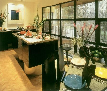 敞開(kāi)式,理論上是將廚房與餐廳或客廳相連的一面非承重墻打掉,使廚房與餐廳合二為一。由于東方人的飲食習(xí)慣與西方人有較大區(qū)別,因此,設(shè)計(jì)師對(duì)敞開(kāi)式廚房作了有中國(guó)特色的改造。如用一面玻璃磚墻加以分隔,既保證了油煙不外散,又可利用玻璃磚墻打造透光和折射光線的效果,使內(nèi)外都感覺(jué)到明亮和通透。
