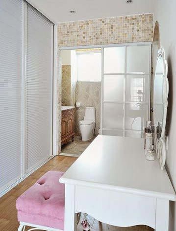 主臥里衛(wèi)生間與梳妝臺僅是移門相隔,手工做到墻頂?shù)囊鹿袷鞘占{的最佳場所。