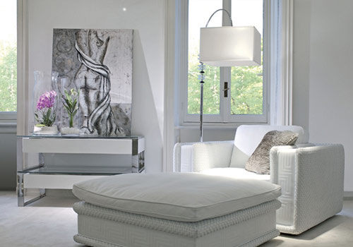 右側(cè)單人沙發(fā)Soft Couture和配套的方形坐墩,白色真皮手縫圖案。沙發(fā)參考價格10000元,坐墩參考價格50000元。靠墻面擺放的是咖啡桌Oscar,金屬結(jié)構(gòu)配有白色上漆抽屜。參考價格77000元。窗前落地?zé)鬜ound參考價格37000元。