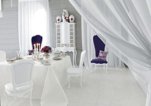 餐桌遠(yuǎn)端擺放實木扶手椅Queen Dotsenko:白色上漆結(jié)構(gòu),軟包椅面和靠背外覆藍(lán)色天鵝絲絨面料。參考價格60000元。餐桌上擺放與Rosenthal合作生產(chǎn)的手繪陶瓷餐具Flower Fantasy。價格580元起。