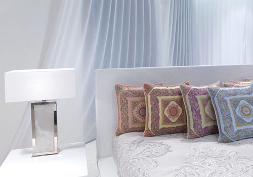 臺燈Marble使用明亮的鍍鉻材質(zhì)。提花靠墊的鮮艷色彩同整體的純白環(huán)境形成鮮明對比??繅|參考價格1500元起。