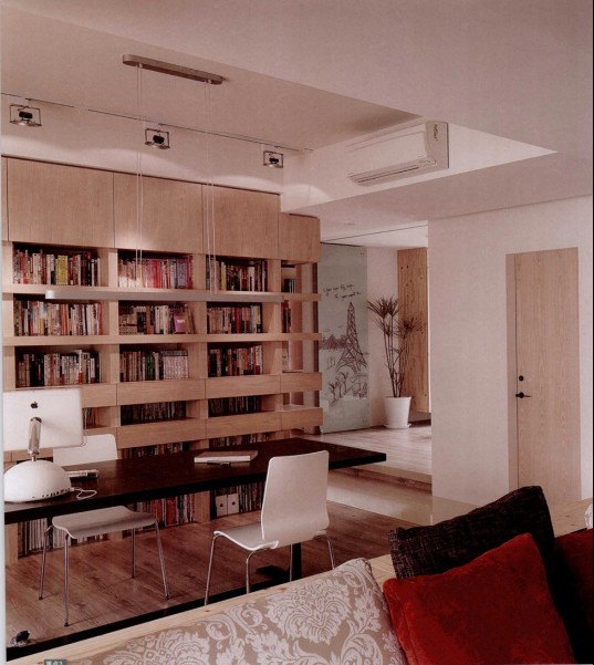 為滿(mǎn)足各種尺寸的書(shū)籍及CD片收納,設(shè)計(jì)以木作量身定制層板,并以門(mén)片變換柜體,豐富書(shū)墻的“功能”。