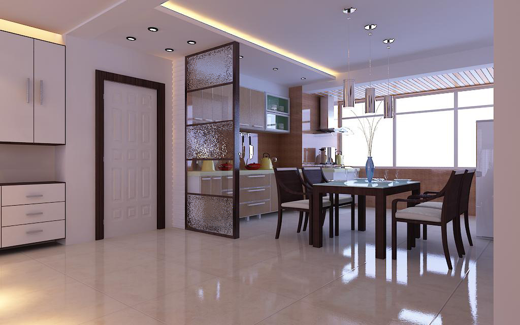 此戶型沒有放餐桌的位置,怎么擺放餐桌都沒有位置,廚房的面積也不大,最好的辦法就是把廚房的墻打掉做成開放式的廚房,客廳與餐廳僅用一個玻璃屏風(fēng)做隔墻,再就是把廚房陽臺的墻打掉與廚房相連,陽臺頂上吊條形的鋁扣板頂。廚房的柜體都是采用防火板?,F(xiàn)在市場上用的最多的就是防火板了,因?yàn)樗钦w櫥柜的主流用材,基材為密度板,表面飾以防火板。廚房的頂部做了簡單的直線的石膏板吊頂。呵呵,這樣看廚房里面加放了餐桌是不是也顯得不擁擠了呢?是不是感覺明顯的加大了不少,餐廳的燈光很重要既不能太強(qiáng)又不能太弱,燈光則以溫馨和暖的黃色為基調(diào),再在上面掛幾個不銹鋼吊頂是不是顯得很大方呢?餐廳旁邊的墻上滿墻涂刷暖色調(diào)的藝術(shù)涂料并掛兩幅藝術(shù)油畫,再配上頂部照下來的燈光,廚房一下子暖意起來了,平時主人在這吃飯的時候也增加了食欲。餐廳的地面鋪的是600*600的拋光磚,一直延伸到客廳。